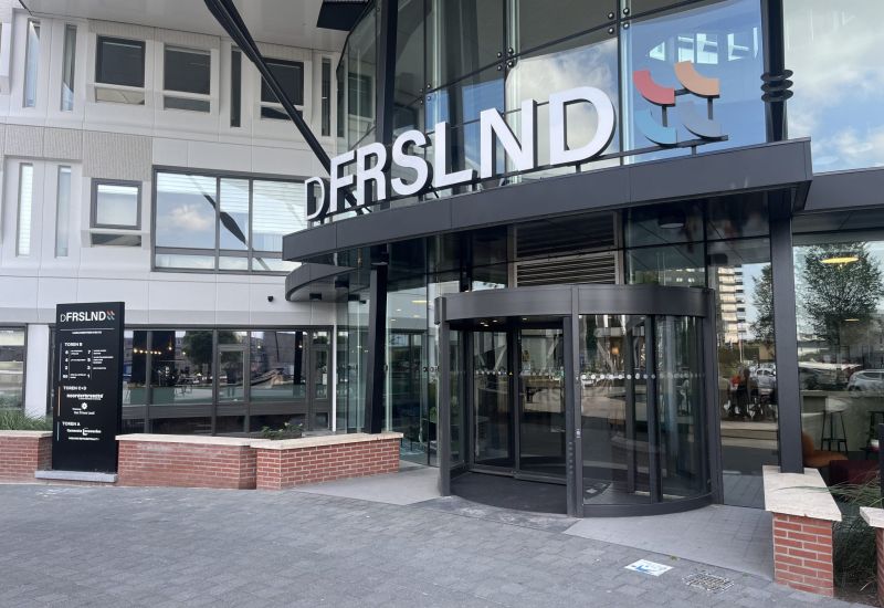 Met een knipoog naar de zorgverzekeraar prijkt inmiddels de nieuwe naam van het kantoorgebouw op de voorgevel: dFRSLND.