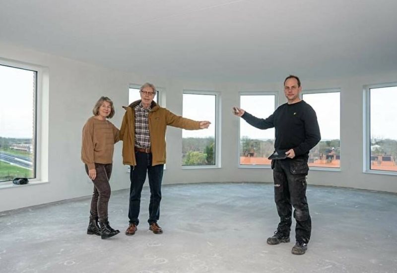 Familie Katsma ontving als laatste de sleutels uit handen van onze aannemer Lont. Zij betreden het penthouse op de vijfde verdieping. Willem Katsma: