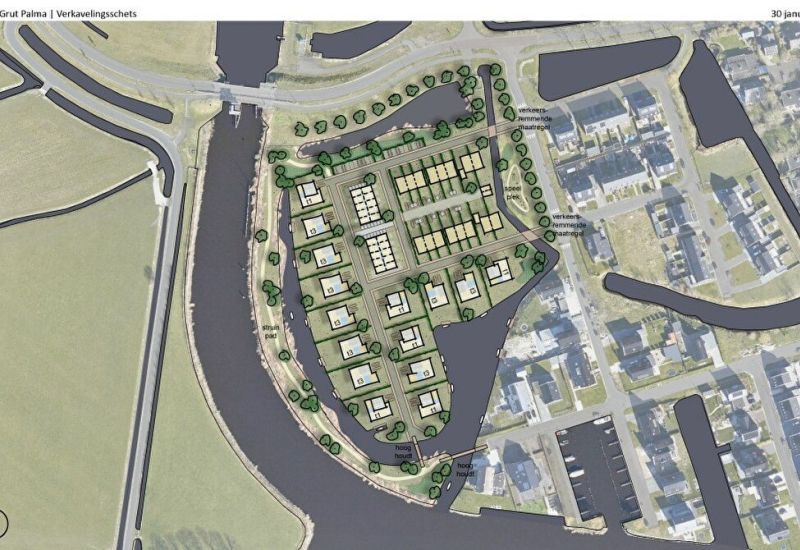 Het verkeer wordt op twee plekken ontsloten via de Palmastrjitte. Een mooie meerwaarde voor het dorp is ook de wandelroute langs het kanaal rondom Grut Palma West. Voor direct aanwonenden van het plangebied heeft deze ontwikkeling enige impact, maar door kavels te ontsluiten aan het open vaarwater proberen we extra woonkwaliteit te creëren.